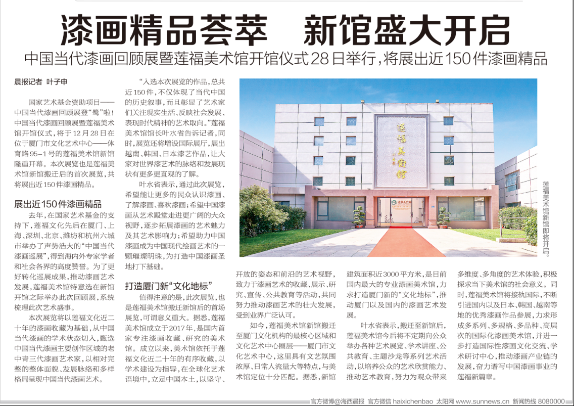 媒體關注 | 漆畫精品薈萃 新館盛大開啟 中國當代漆畫回顧展暨蓮福美術館開館儀式28日舉行,將展出近150件漆畫精品