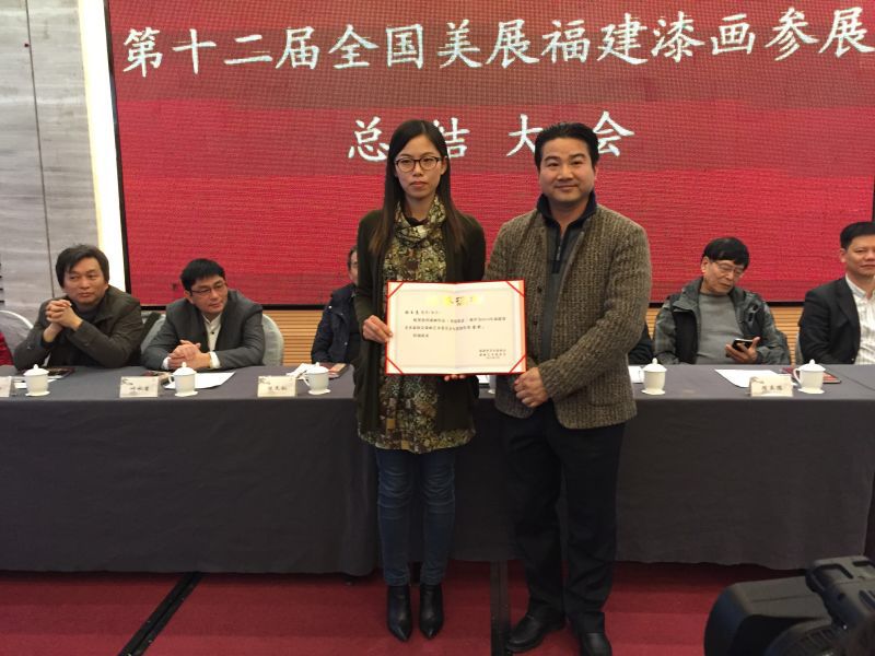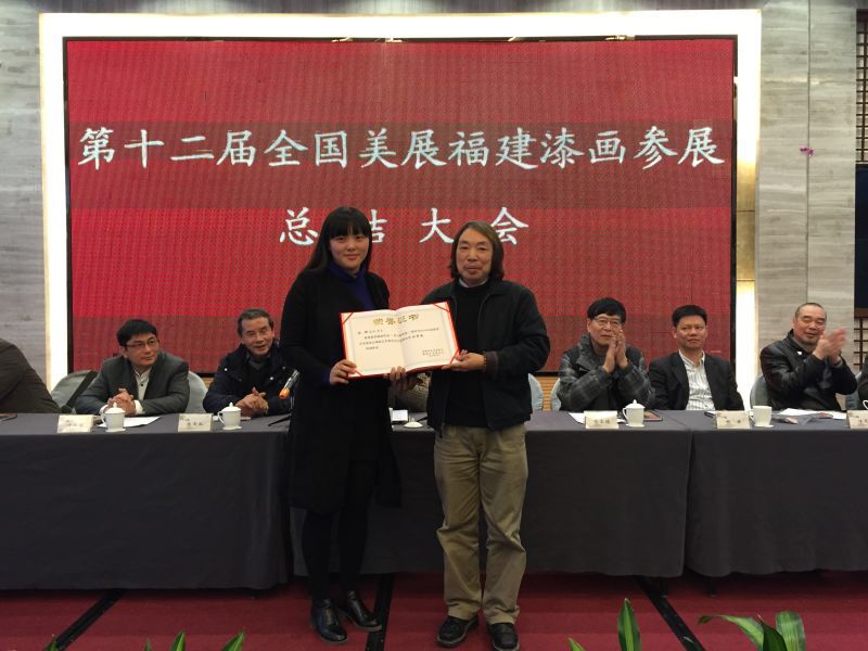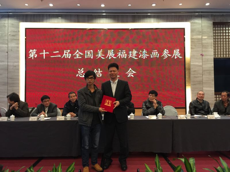 2014年,是福建漆畫迄今為止在全國美展上最為輝煌的一年:全國美展漆畫展區(qū)在全國一千七百多件參評作品中甄選306件參展,其中閩籍作品113件入選,且尚不涵蓋在閩學(xué)習(xí)創(chuàng)作的15件外省籍作者作品。最終總評中,閩籍漆畫作品包攬金、銀、銅獎以及3個優(yōu)秀獎(本屆全國美展漆畫板塊總共設(shè)置了一金一銀一銅7個優(yōu)秀獎),其中,廈門大學(xué)美術(shù)系碩士生張玉惠作品《織情敘意》榮獲金獎;福州沈克龍作品《花事千年》獲銀獎;廈門大學(xué)美術(shù)系本科生林智勛、黃建坤合作作品《舊時光》獲銅獎;福建師范大學(xué)美術(shù)學(xué)院本科生陳娜作品《若只如初見》、廈門大學(xué)美術(shù)系碩士生楊耀斌作品《迷彩青春》、福建師大美術(shù)學(xué)院教師林宜耕和碩士生李濤合作作品《戲畫人生》獲優(yōu)秀獎,創(chuàng)福建地區(qū)參加全國美展有史以來的最好成績。