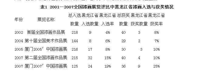 表1 2001—2007全國漆畫展覽評比中黑龍江省漆畫入選與獲獎情況