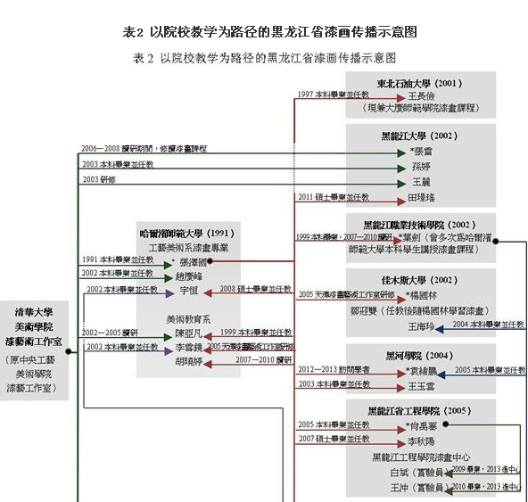 ②表2說明:①院校名稱後方括號內(nèi)的數(shù)字,表示該院校開始漆畫教學的年份;②人名前方的*符號表示該教師為所在院校的漆畫學科帶頭人;③漆畫傳播具體路線用彩色直線與箭頭表示。