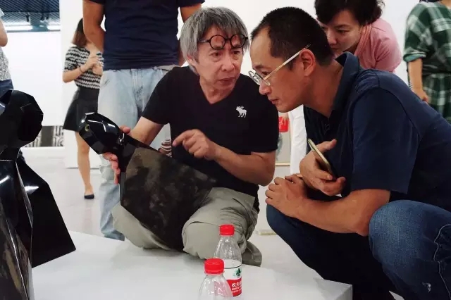 策展人:福建省美術(shù)館館長(zhǎng)唐明修與著名藝術(shù)家、策展人邱志杰教授一起觀看展品