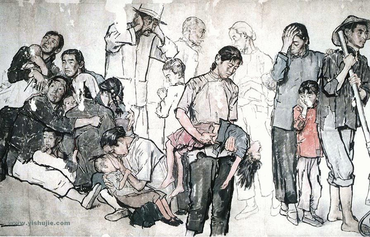走近蔣兆和的《流民圖》,就是一種精神上的藝術(shù)審苦之旅。往常那些一般化唯美,無疑與此畫作內(nèi)在的一種強(qiáng)烈、巨大的視覺震憾力,以及所反映的民族苦難和精神內(nèi)含格格不入。顯然,只有深入審苦這一情感體驗之中,才能徹底從作品主題及藝術(shù)表現(xiàn)諸多方面,構(gòu)建不同于一般唯美的另一種鮮明的繪畫語言風(fēng)格和感受——藝術(shù)上的精神審苦。雖然在這些藝術(shù)巨作上,還不能完整地勾劃出審苦的全部內(nèi)容,從美術(shù)史方面還可以列舉出許多這樣或那樣的創(chuàng)作。但以審苦精神為情感主線表現(xiàn)的作品,它使藝術(shù)崇高和博大雄渾的這一面得以完整鮮明地展現(xiàn)出來。也就是說在人們的精神世界、文化空間里,除了一類屬于優(yōu)雅唯美的視覺藝術(shù)之外,還要具有從另一面形成能夠惕勵人的精神世界的審苦藝術(shù)。而這兩種表現(xiàn)人類情感世界的視覺效果,并行不悖。
