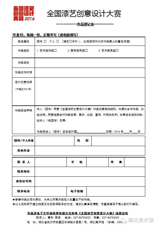 郵寄地址:湖北省武漢市武昌區(qū)東湖路三官殿一號(hào)湖北美術(shù)館 “全國(guó)漆藝創(chuàng)意設(shè)計(jì)大賽”組委會(huì)收